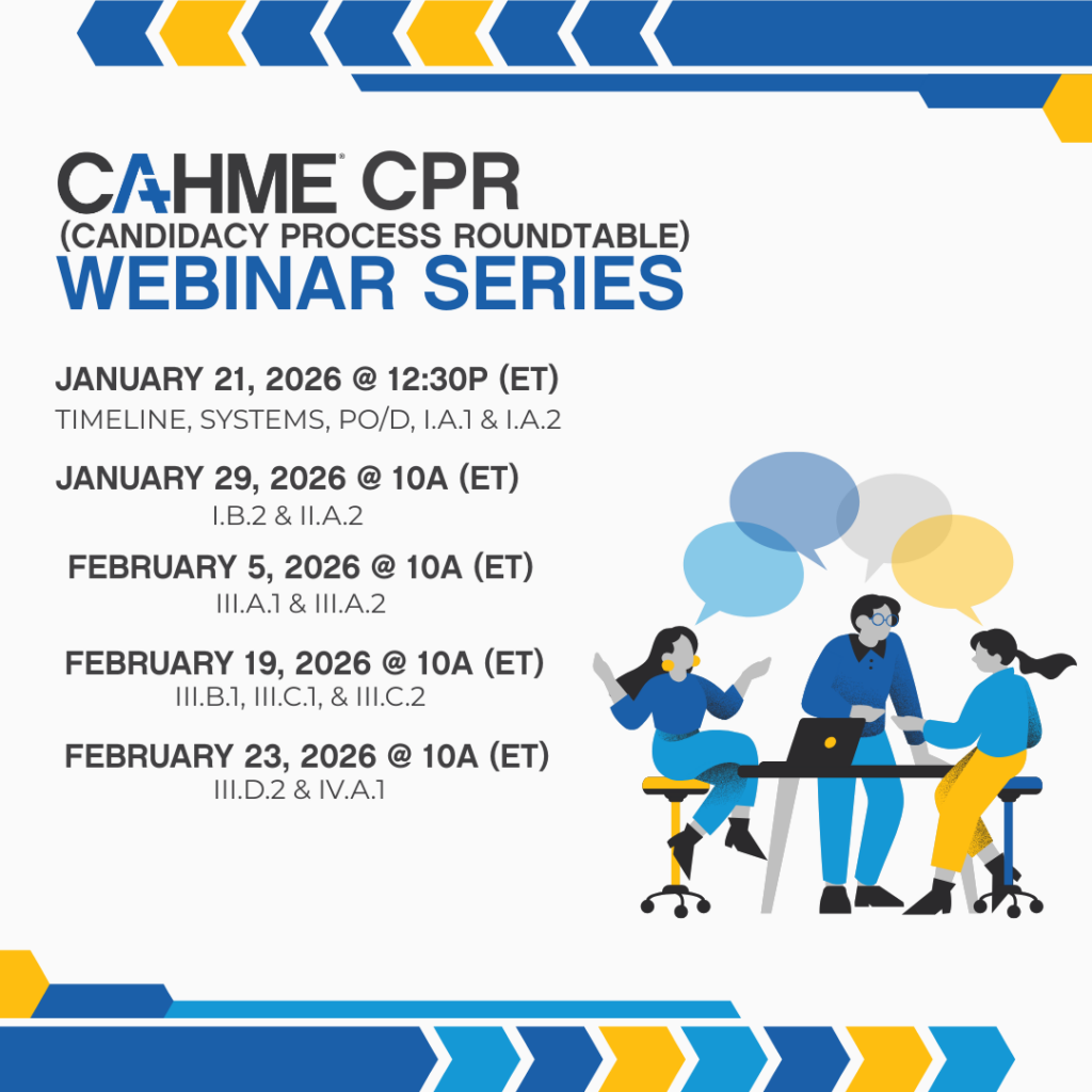 Effective alumni engagement is a powerful driver of program quality, student success, and continuous improvement. In this CAHME Mentorship Circle webinar, Kelly Scheiderer (The Ohio State University), Dr. Rebecca Sale (Columbia University), and Dr. J’Aime Jennings (University of Alabama at Birmingham), leaders from our CMC programs with more than 50 years of continuous accreditation across their programs. They will share proven strategies and lessons learned. Participants will gain practical, replicable approaches to leveraging alumni for mentorship, career support, curriculum feedback, and accreditation-ready continuous improvement.
